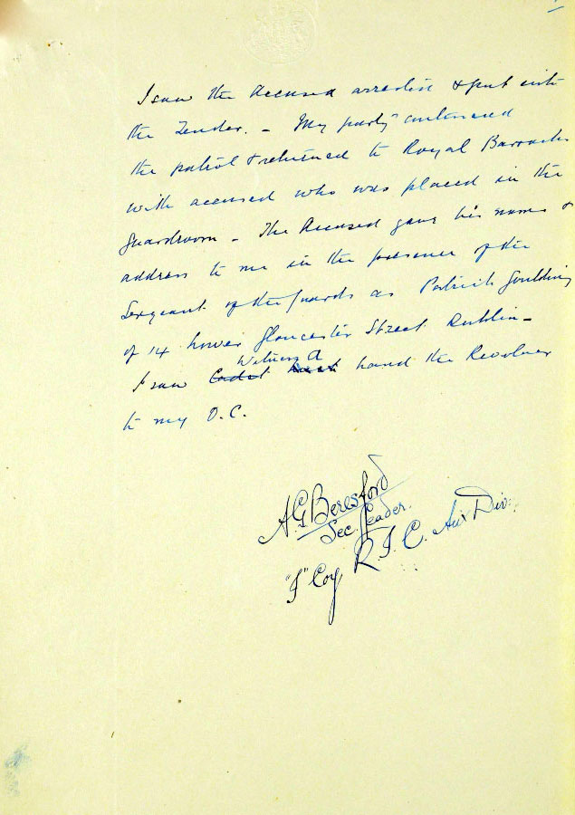 A patrol from I Coy stopped Patrick Goulding, of 14 Lower Gloucester St, Dublin and found a revolver on him. A court martial on 1 Jun 1921 sentenced him to 18 months gaol