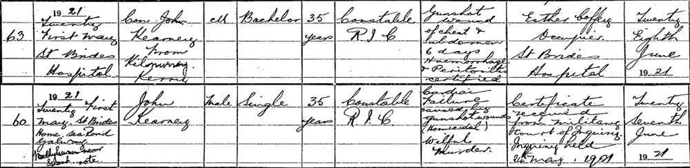 1921 May 21 Died of his wounds at St Brides Hospital, Galway