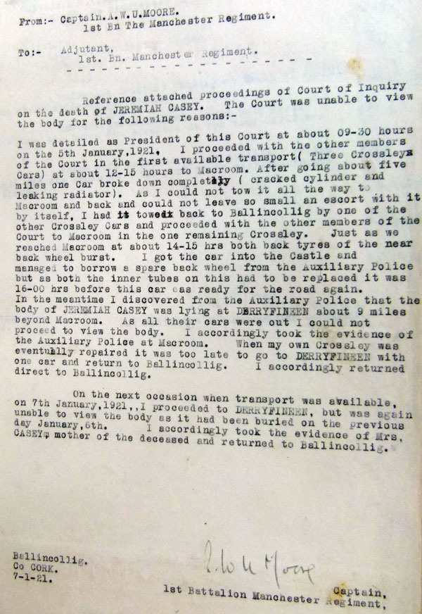 A patrol from C Coy was searching a house at Derryfineen when a number of men ran away from the house. They opened fire, and one man, Jeremiah Casey died as a result. Evidence was given by T/C ER Wilson and T/C HW Owen was also there . The verdict was that he was shot by ADRIC in execution of their duty. The patrol was under DI3 Fleming.
