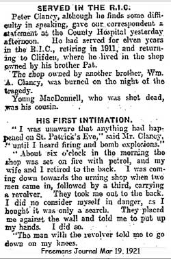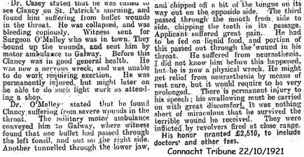 1921 Oct 22. The doctors inquest report suggests that "the ex-constable was put up against a wall, and shot" is closer to the truth than "wounded by a stray bullet." Clancy had received 3 bullets to the head, one through his throat, a second through the lower jaw, and a third through his mouth. All wounds were inflicted by revolvers fired at close range.