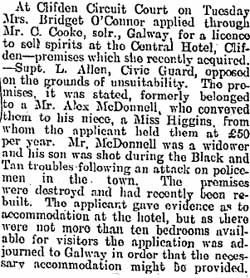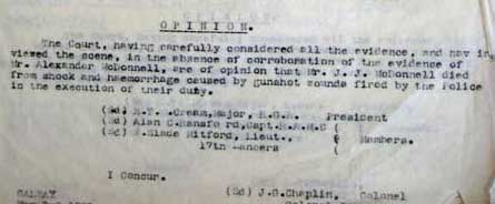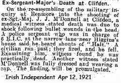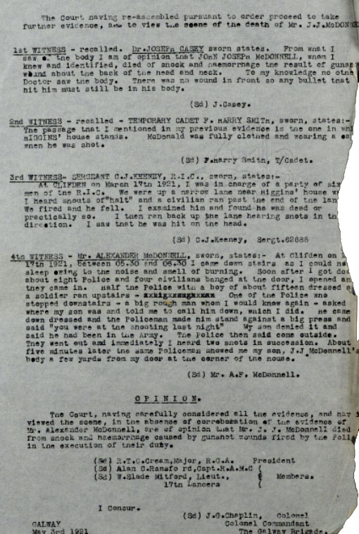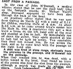 1921 The military inquiry was told that "death was due to shock following bullet wounds to the head" . A police sergeant in charge of 6 RIC men was in the narrow lane near Higgins' house. He heard shouts of "Halt", a civilian ran past, they fired and he fell. McDonnell was fully dressed and wearing a cap