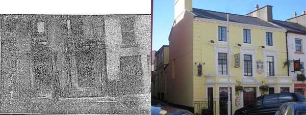 Grainy newspaper photo of McDonnell's Hotel after burning and the hotel today