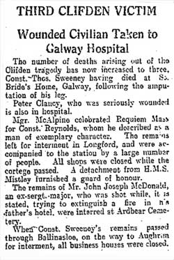 1921 Mar 16. The IRA ambushed a 4 man RIC patrol in Clifden. Two RIC constables were killed. The IRA flying column of the West Galway (Connemara) Brigade was led by Peter (Petie) Joe McDonnell. It retreated to the Maam valley, where they ambushed British reinforcements at Munterowan and Screebe.
