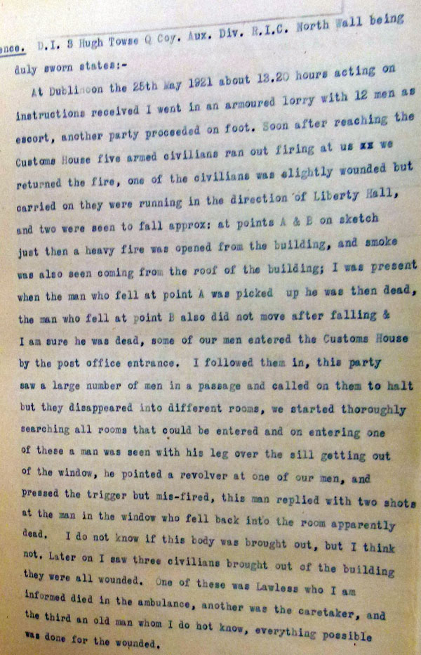 1921 May 25. At about 13.10 hours, information was received from DMP that the Custom House had been rushed by approximately 100 civilians.
