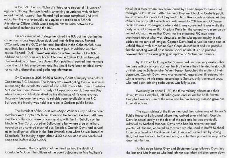 A court of inquiry with these three officers, who were members of the Machine Gun Corps based in Ballyvonaire, as the presiding officers was held to inquire into the death of Constable Patrick McCann, from an accidental discharge of his own revolver. The inquiry was held in Corbetts Public House in Cappamore, as there was not a suitable room in the RIC Barracks. After the inquiry the 3 appear to have had one long bender and only arrived back in their Ballyvonaire barracks at 5.30am. Along the way they stopped at, and demanded entrance to, a number of pubs. At one of these, Davis shot Leonard