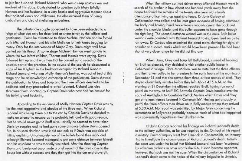 1920 Dec 30. Captain W Davis was identified, in a British Court of Inquiry, as the man who shot Richard Leonard at Boskill near Caherconlish. Charges against Davies were later dropped but his guilt was clearly established. The two other army officers with him were Major William Grey and Lt G. M. Loup.