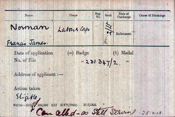 1918 Aug 25. Entered for a “Silver War Badge” generally awarded on being injured and invalided out, presumably because of mustard gas exposure. However, this was cancelled as he was still in service on this date