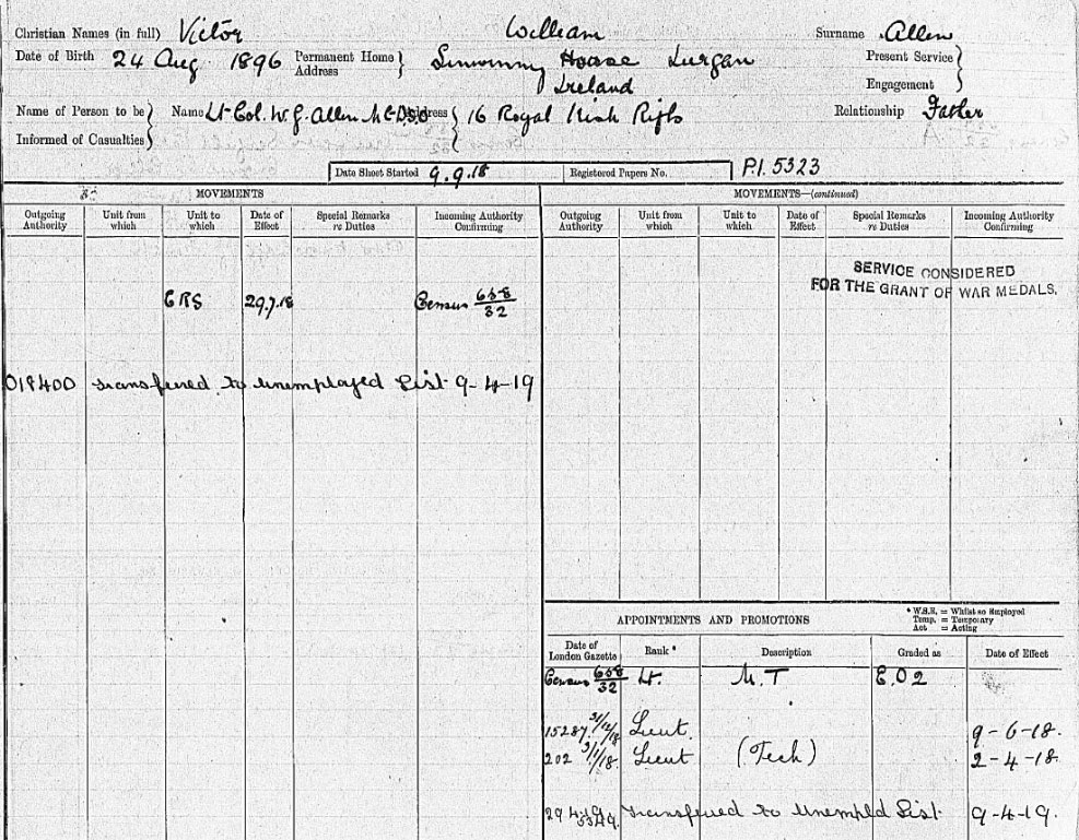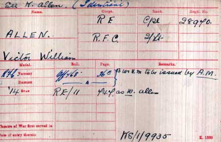 1916 Oct 30. The undermentioned temp. 2nd Lts. (on prob.) are confirmed in their rank : — V. W. Allen.