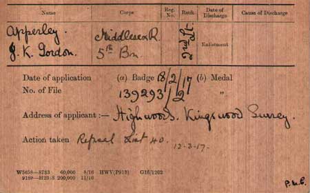 1918 Mar 6 Labour Corps. 2nd Lt. J. K. G. Apperly (Midd'x R., Spec. R.) is apptd. to the Corps. with seniority 12 June 1917