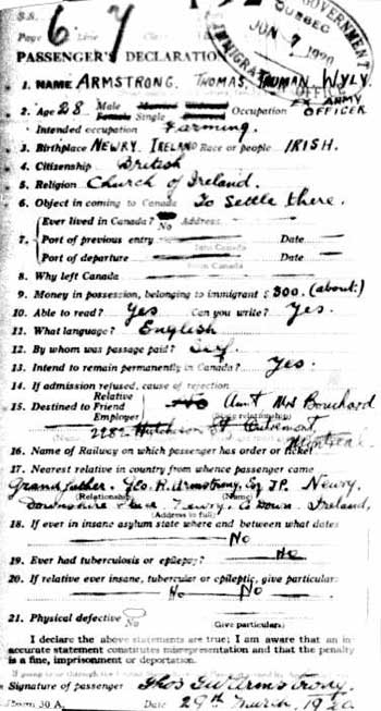 1920 Jun 7. Arrives from UK in. Canada. He wants to settle and farm