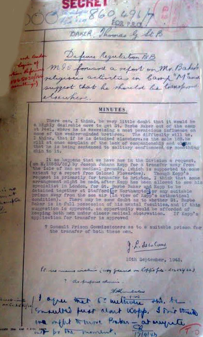 During the Defence Regulation 18B fascist round-ups, Thomas went briefly on the run, shaving his distinctive walrus moustache but was soon caught and jailed for the duration of the War, being an unrepentant Nazi. During reviews by the internment committee, where internees had a chance to prove their loyalty and secure their release, and which many took advantage of, Baker always gave answers in the positive as to his ideology, which only convinced the advisory panel that it was best to keep him locked up. Unusually Baker was kept interned for a suspended period and he was amongst the last of the detainees to be released, (HO 45/25732 120508) whereas most internees, including Oswald Mosley, had been released by 1943.