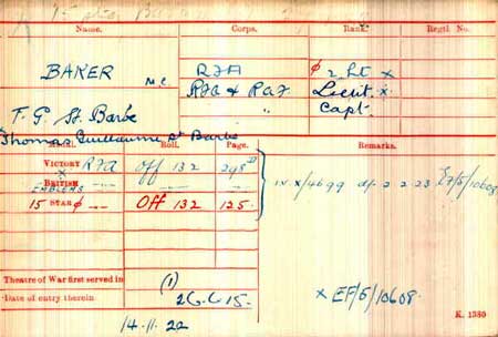 1917 Oct 18. MC Gazetted. 2nd Lt. Thomas Guillaume St. Barbe Baker, R.G.A., Spec. Res. The later citation was on citation LG 7 Mar 1918. For conspicuous gallantry and devotion to duty. When the entrance to the signalers' dug-out was hit and the staircase destroyed, one of the occupants being severely wounded and the remainder rendered insensible from fumes, he descended with a party by a second entrance and got all the men away, though twice rendered unconscious by the shell fumes.