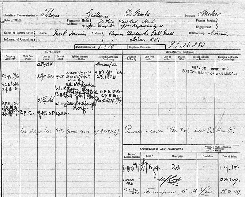 1919 Mar 28. RAF The undermentioned are transferred to the unempld. list: — Lt. T. G. St. Barbe-Baker.