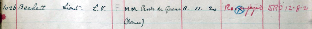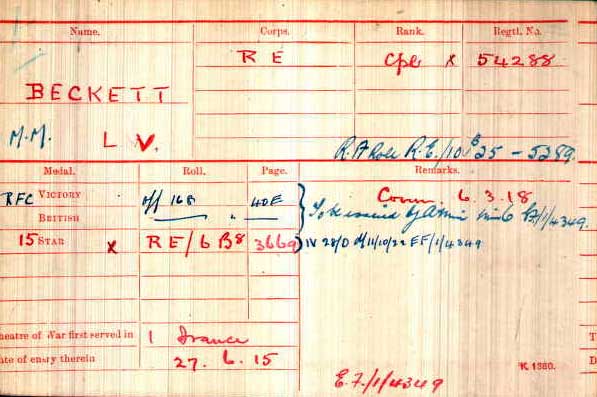 1917 Aug 28 MM Gazetted. His Majesty the KING has been graciously pleased to award the Military Medal for bravery in the Field to the undermentioned Non-Commissioned Officers and Men: — 54288 Cpl. L. V. Beckett, R.E.