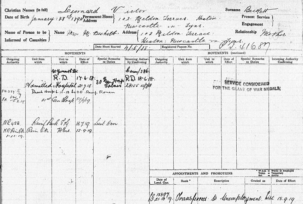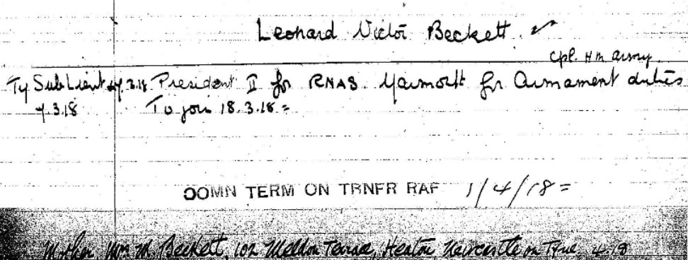 1919 Sep 18. Transferred to unemployed list. . Lt. L. V. Beckett. He moved from RNAS to RFC as the whole contingent were transferred.