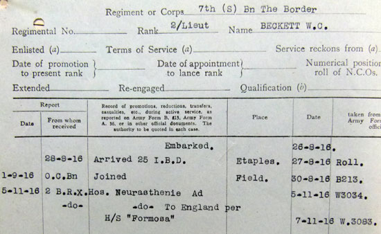 1916 Sep 5. Shrops. L.I. The undermentioned cadets to be temp. 2nd Lts. (on prob.) (attd.): — William Charles Beckett.
