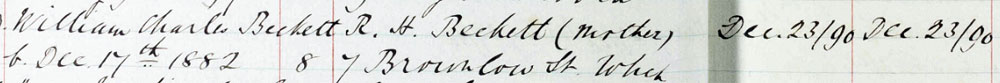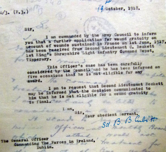 1917 Jul 29. MC Gazetted. Temp. 2nd Lt. William Charles Beckett, attd. Shrops. L.I. For conspicuous gallantry and devotion to duty. Although severely wounded, he led a raid into the enemy's front line, and with great courage and determination remained until he had brought it to a successful issue, His presence had a great moral effect on his party.