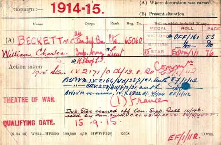 1915 Jan 25. Enlists in Canadian Exp Force. His next of kin is his wife Madge Farrington Beckett at Tan Home Av, Montreal. He was a storekeeper