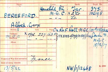 1917 Dec 19. The undermentioned cadets to be temp. 2nd Lts. (attd.): —Machine Gun Corps (Infantry); Alfred George Beresford