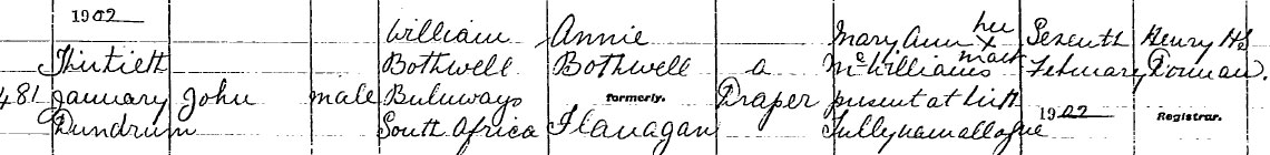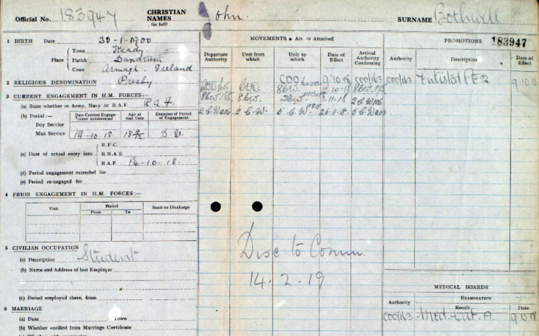 1902 Jan 30 Born (RAF record) .There is an Armagh birth of John Bothwell registered Jan/Mar 1902 in Armagh. I assume he lied about his age to enlist