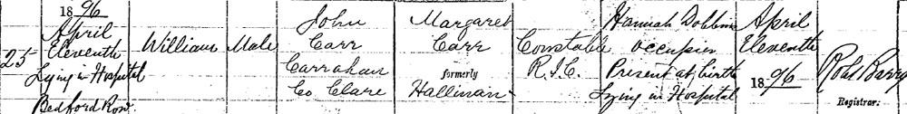 1919 Jul 11. William’s father John Carr died in Gort Workhouse Hospital from pneumonia, ‘following erysipelas caused by a scalp wound’ He was aged 57, married, an RIC pensioner and farmer. He had been struck on the head with a hurley by John Quin from Gort who stated he was protecting his sister who had gone to a dance organised by the police. Quin was sentenced to four months on a charge of manslaughter