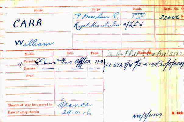 1918 Nov 30. R. Muns. Fus. The undermentioned temp. 2nd Lts. to be temp. Lts. : — W. Carr