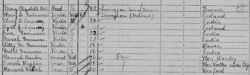 1901 census at Wellington Lodge, Wellington Square West, Cheltenham. A visitor there with his mother.