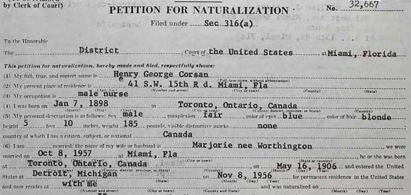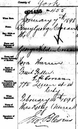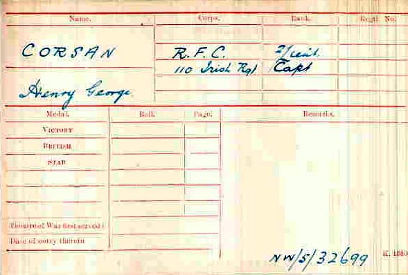 1898 Jan 7. Born Henry George Corsan (a discrepancy between RAF record and Ontario Birth Record - both Jan 7. I suspect he lied to get into army. ) In York Ontario, son of George Hebden Corsan , a fruit peddler and Nora Warren