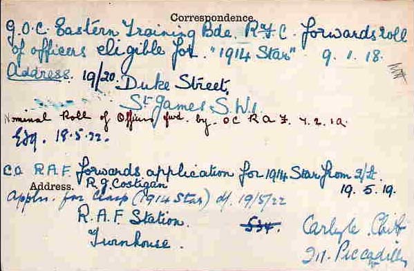 1918 May 6. 2nd Lt. R. J. Costigan (late Gen. List., R.F.C. on prob.) is confirmed in rank as 2nd Lt., Grade (A.).