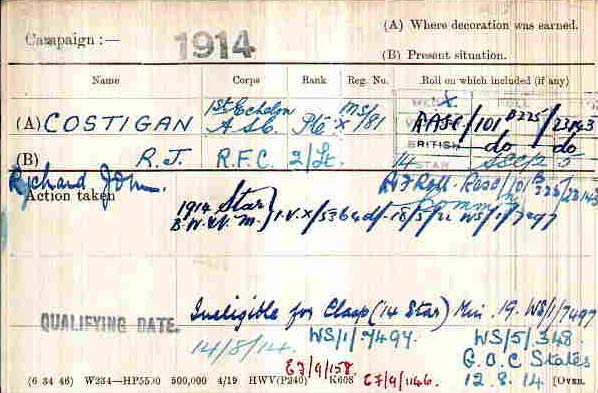 1917 Sept 26. The undermentioned Cadets to be temp. 2nd Lts. (on prob.) General List (R.F.C.) Richard John Costigan.