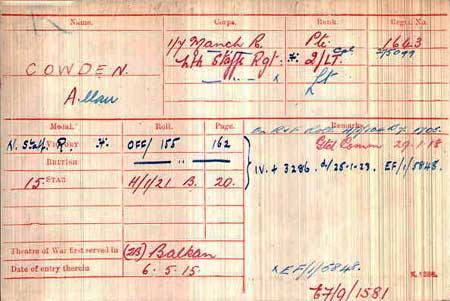 1919 Nov 1. N. Staff. R. Temp. Lt.. A. Cowden relinquishes his commission on completion of service, and retains the rank of Lt.