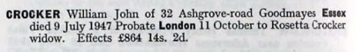 1939 Register. Living with wife Rosetta at 32 Ashgrove Road , Ilford M.B., Essex. He is a Travelling Soap Salesman and in Officers Emergency Reserve