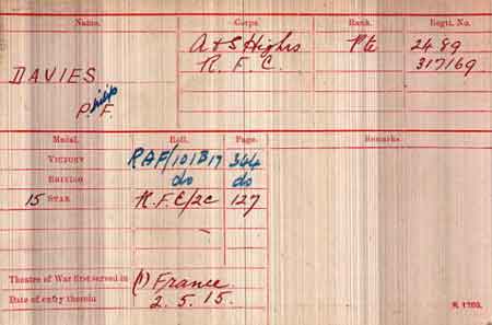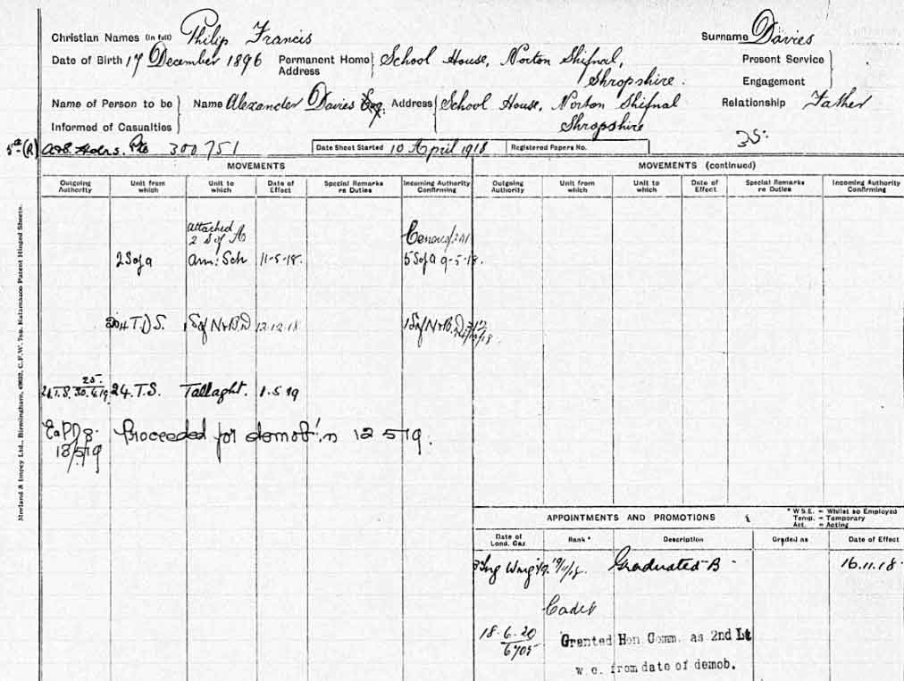 1920 Jun 19. RAF The following Cadets are granted Hon Commissions as 2nd Lts from the date of their demobilisation - 300751 Philip Francis Davies