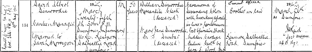 1942 Mar 28. Died at Kenmore Dalbeattie Rd, Dunfries. Cancer of the Colon