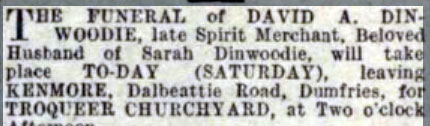 1923 Feb 20 The Firm of DINWOODIE & MILLER.. Hotelkeepers, King's Arms Hotel, Castle-Douglas, of which the Subscribers were the sole Partners, was DISSOLVED by mutual consent. The Subscriber John Paisley Miller, who has acquired the Business, will uplift all the debts due to the Firm, and discharge the debts and liabilities of the Firm, as at said date Witnesses to the Signature of the said David Albert Dinwoodie ...