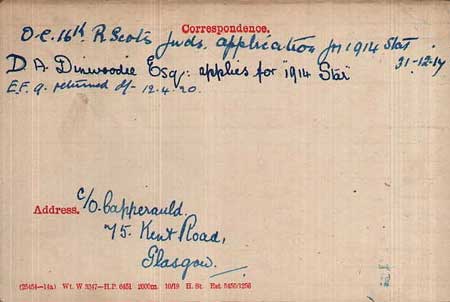 1920 Nov 10. Joined ADRIC with service no. 1020 . Posted to I Coy. Father at 30 Dalzial Gardens, Goth Hill, Glasgow
