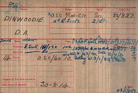 1918 Dec 27. R Scots. The undermentioned temp. 2nd Lts. to be temp. Lts.: — D. A. Dinwoodie.