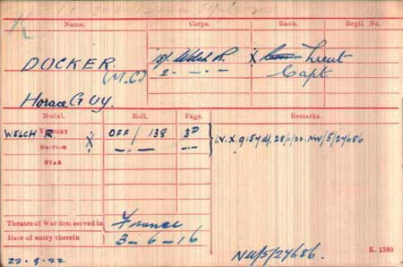 1919 Oct 4. MC Gazetted T./Lt. Horace Guy Docker, 2nd Bn., Welsh Reg. He ably led his platoon on the 18th October, 1918, near Wassigny, and rounded up a machine-gun nest. He showed marked courage throughout the attack. Again, on 23rd October, 1918, near Rejet de Beaulieu, when his company commander had become a casualty, he took command, and in spite of heavy casualties gained and consolidated all his objectives. His work was of the highest order.