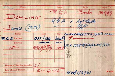 1919 Sep 18. RGA. The undermentioned 2nd Lts. to be Lts.: — J. Dowling, M.M.
