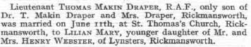 1896 Sep 21 Born Downham, Norfolk. Son of Thomas Makin Draper, a physician and surgeon