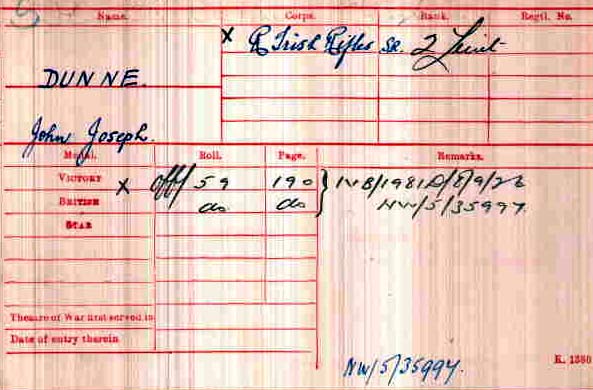 1918 Jan 30 Commissioned. His father is James Dunne MBE, ex-Supt in Dublin Metropolitan Police. He had not been outside UK while an Other Rank