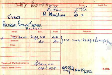 1918 Sep 29. Earns MC. T./Lt. George Emlyn Thomas Hulse Evans, 11th Bn., R. Fus. During operations near Ronssoy, The Knoll and Vendhuile, on the 29th/30th September. 1918, he never failed to get in communication with both the forward companies and brigade. His work under most trying- circumstances enabled communication to be maintained which assisted in the successful result of the operations. He showed great keenness and coolness under fire.