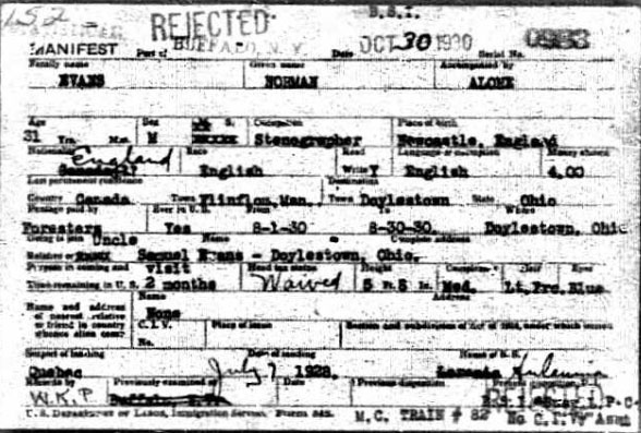 1930 Oct 30 Crosses US border at Buffalo from Canada, but is "Rejected". Attempting to visit his uncle, Samuel Evans in Doylestown, Ohio. His application was rejected, and he was off-loaded at Bridgeburg, a suburb of Fort Eerie in Canada.