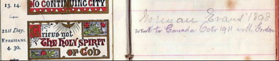 Part of Florence Olive Evans' diary recording Norman's birth in 1898. A note written underneath by R.L.E. at a later date reads, "went to Canada Oct 1911 with Gordon"