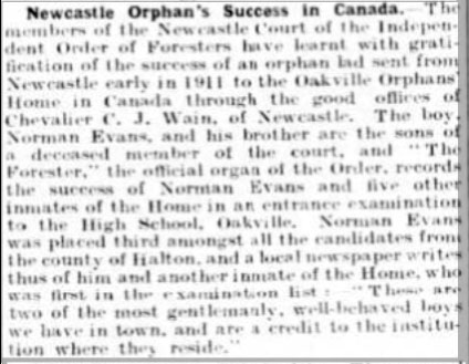 1912 Oct 5. Article from The Staffordshire Advertiser - Newcastle Orphan's Success in Canada The members of the Newcastle Court of the Independent Order of Foresters have learnt with gratification of the success of an orphan lad sent from Newcastle early in 1911 to the Oakville Orphans Home in Canada through the good offices of Chevalier C. J. Wain of Newcastle. The boy, Norman Evans, and his brother are the sons of of a deceased member of the court, and "The Forester", the official organ of the Order, records the success of Norman Evans and five other inmates of the Home in an entrance examination to the High School, Oakville. Norman Evans was placed third amongst all the candidates from the county of Halton, and a local newspaper writes thus of him and another inmate of the Home, who was first in the examination list, " These are two of the most gentlemanly, well-behaved boys we have in town, and are a credit to the institution where they reside"