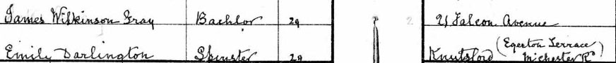 1921 census at 64, North Lonsdale Street, Stretford, Lancashire. James Wilkinson Gray Head Male 1891 29 Northwich, Cheshire, England - Engineer Labourer Emily Gray Wife Female 1891 30 Knutsford, Cheshire, England