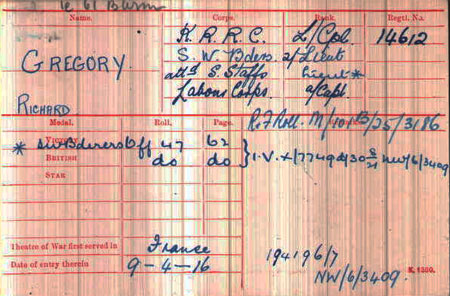 1919 Mar 3. S Wales Borders. Temp, Lt. R. Gregory to be actg. Capt,- with pay and allces. of Lt, while em'pld. as actg. Adjt., 6th Bn. 3 Mar. 1919 to 13 Mar. 1919