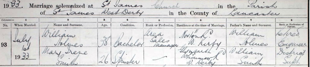 1933 Jul 1. Married Mary Irene Smith (1908–1955 Birth 1908 Death 30 JAN 1955 • Northern Hospital, Liverpool (