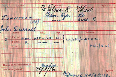 1917 Oct 18. MC Gazetted. 2nd Lt. John Darrell Johnston, Glouc. R. For conspicuous gallantry and devotion to duty. During the attack he led his company through the barrage and took up and consolidated a position. He took command of the forward line and organised the defence of four different units. He displayed exceptional qualities of leadership, and by his cheerfulness and disregard of danger inspired all ranks to consolidate and hold on at .a critical time. His organisation of the line helped the troops on his flanks to hold on to the objectives