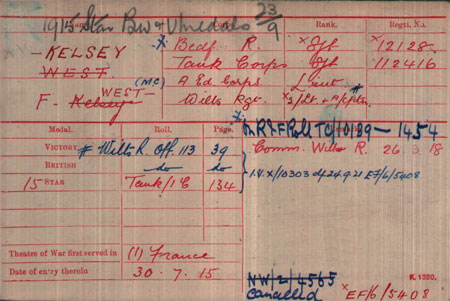 1918 Nov 6 Wins MC. T./2nd Lt. (A./Capt.) Frank West-Kelsey, 1st Bn., Wilts R. During the operations east of Berliamont on 6th November, 1918, he displayed great gallantry and leadership under heavy fire, he led his company across the Sambre river, and led them around the flank of Audnoye, so that the enemy were in danger of being cut off. The enemy finally withdrew